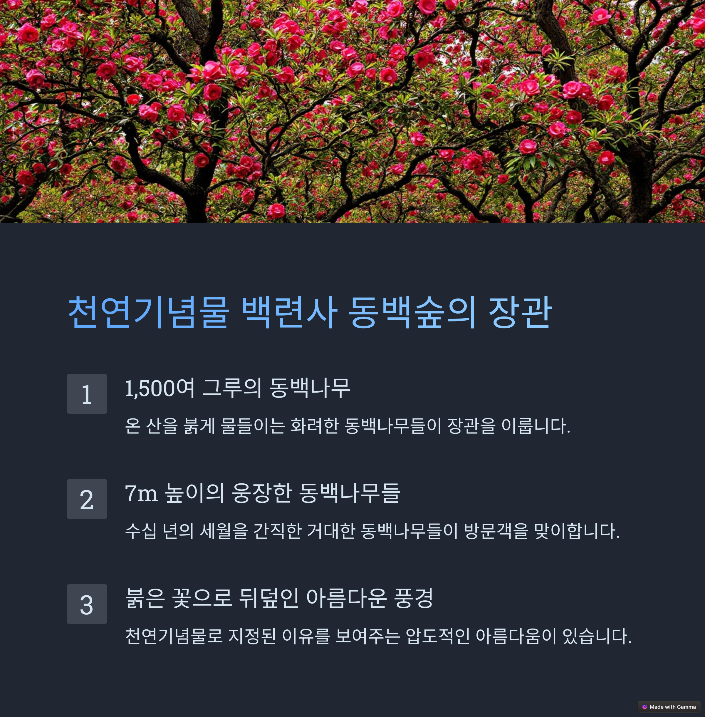 방문 추천 시기 | 3월 중순~4월 초, 동백꽃 절정기 |