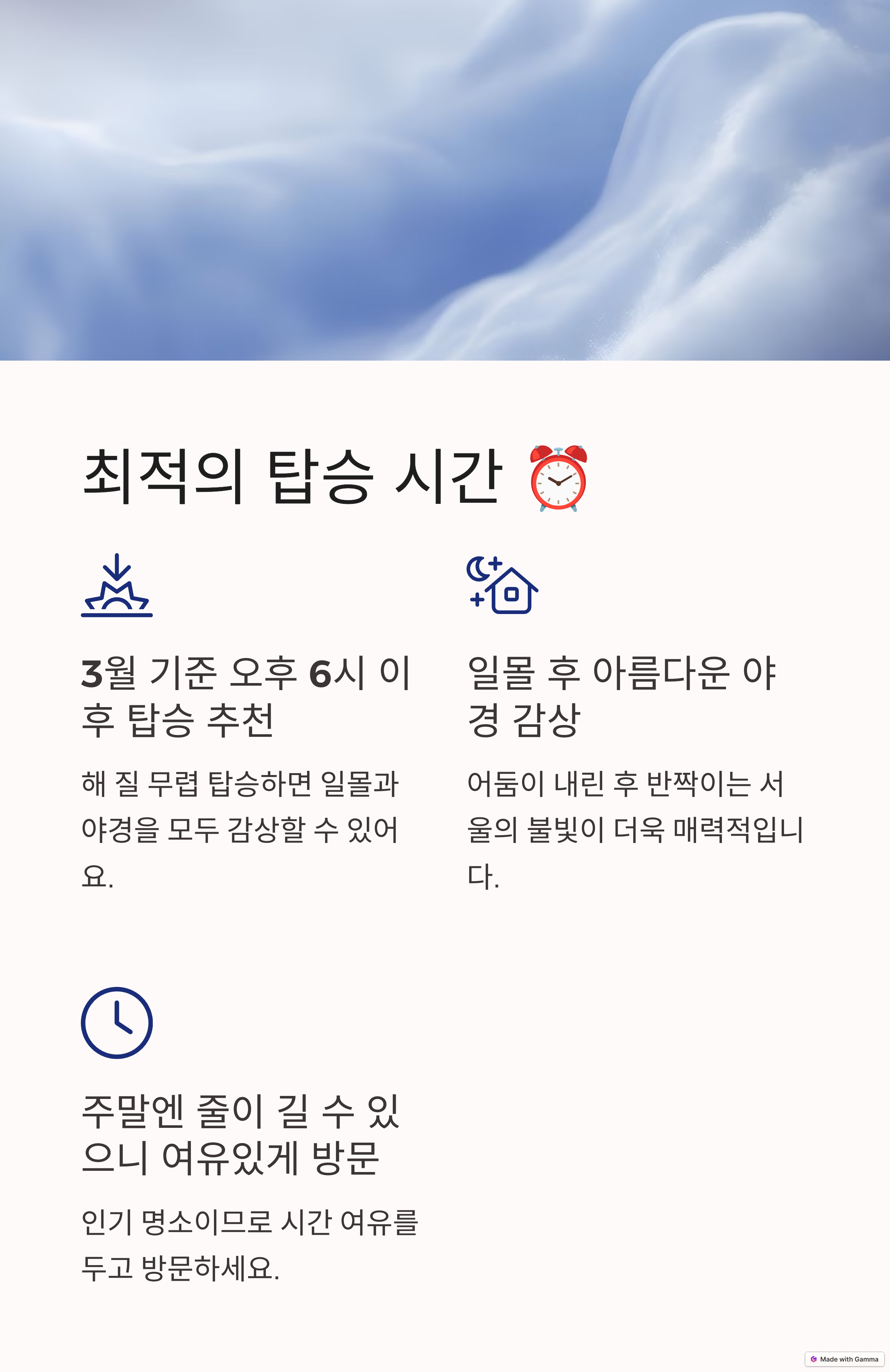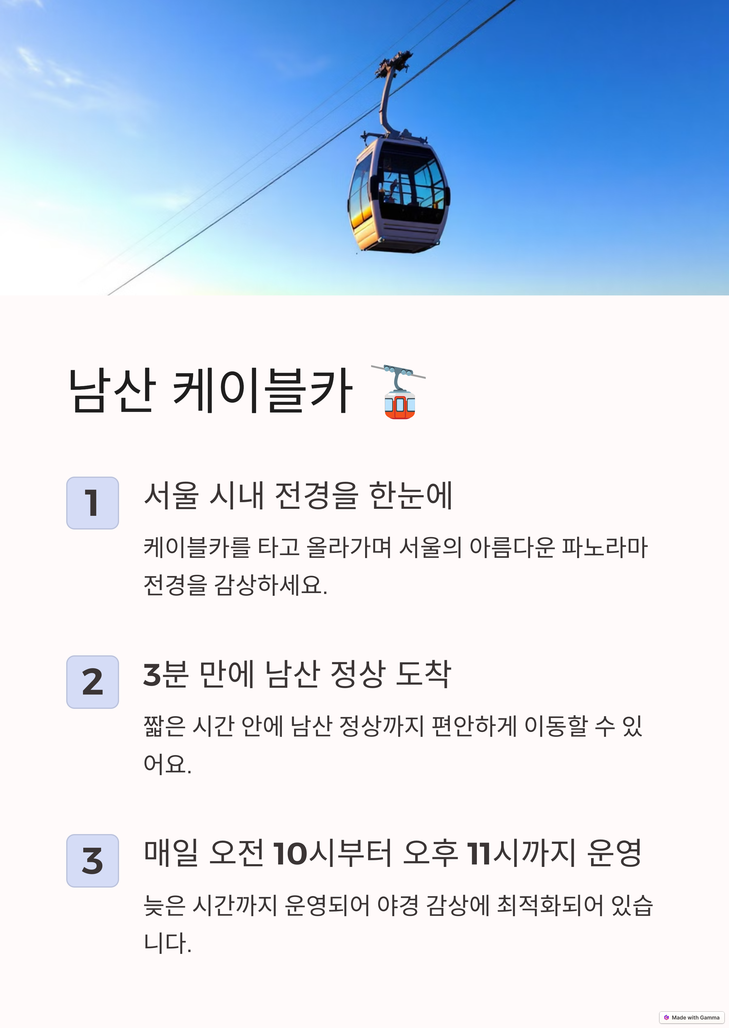 서울의 중심부에 위치한 남산 케이블카는 도심의 바쁜 일상에서 벗어나 여유롭게 서울의 경치를 감상할 수 있는 최고의 명소입니다. 케이블카를 타고 올라가면 넓게 펼쳐진 도심과 한강이 어우러지는 풍경이 눈앞에 펼쳐지며, 일몰 시간에 탑승하면 황금빛으로 물드는 하늘과 밤이 내려앉는 장관을 동시에 볼 수 있습니다. 특히 봄에는 선선한 바람을 맞으며 탑승하는 즐거움이 더해져 더욱 낭만적인 경험을 제공합니다. 왕복 약 3분이면 정상에 도착할 수 있으며, 편리한 교통과 접근성으로 누구나 쉽게 즐길 수 있는 매력을 지니고 있습니다. 서울 여행을 계획 중이시라면 꼭 방문해 보셔야 할 추천 명소입니다.