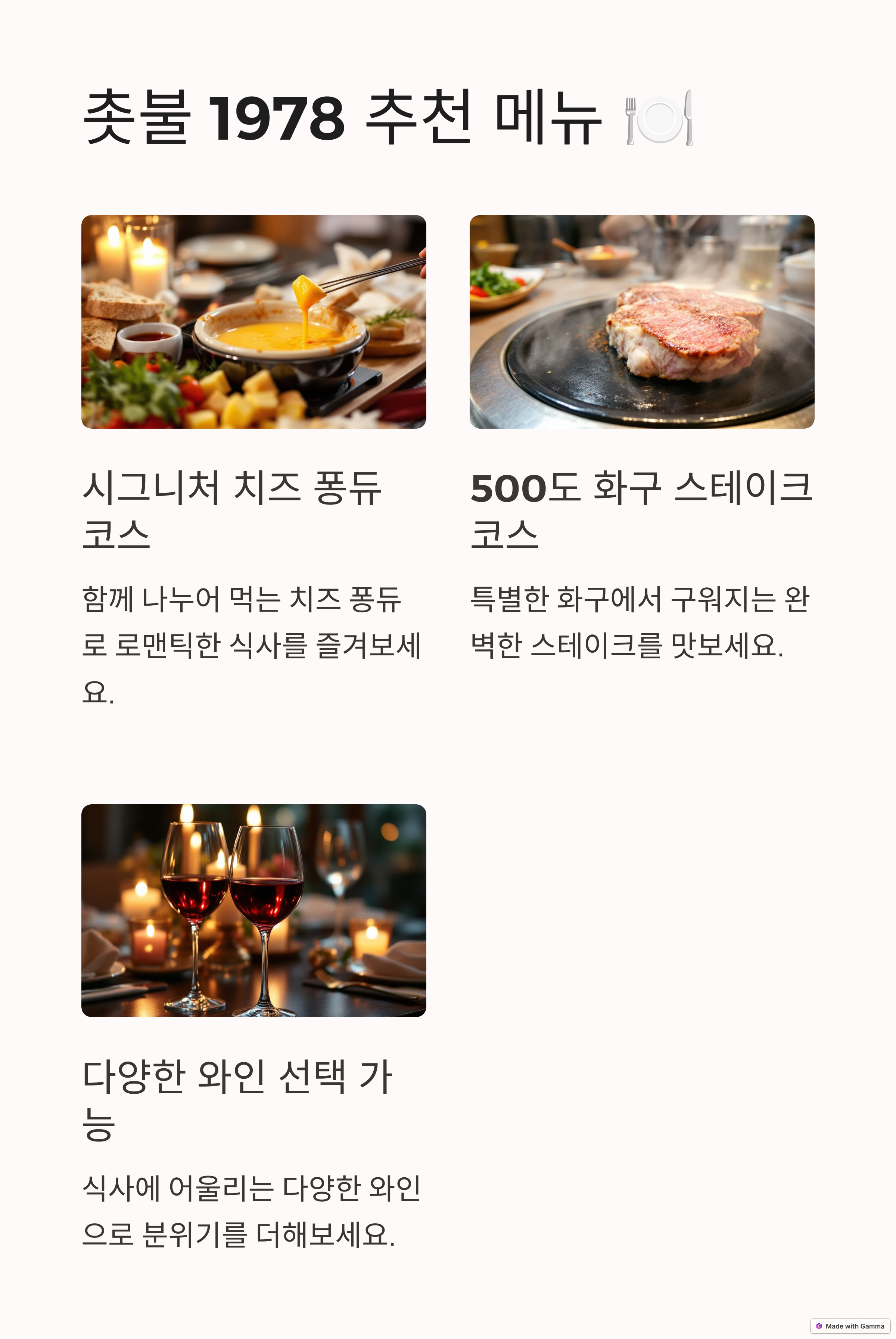 시그니처 치즈 퐁듀 코스와 500도 화구 스테이크 코스 등 다양한 메뉴를 제공하며, 예약은 필수입니다. 와인 선택도 가능해 특별한 밤을 더욱 빛내줍니다. 남산 케이블카와 촛불 1978의 조합으로 서울의 아름다운 야경과 로맨틱한 분위기를 만끽할 수 있는 잊지 못할 주말을 보내보세요.